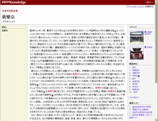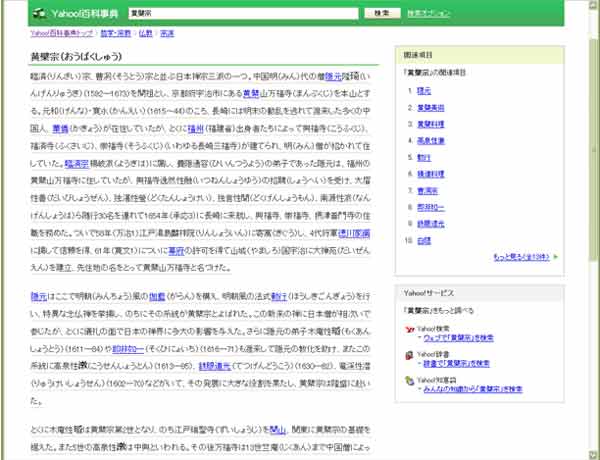 ただ、ジャパンナレッジの方は本文の外欄に、黄檗宗の寺の写真や関連項目へのリンクが貼ってありました。「関連項目」はYahoo!の方では本文中でリンクが貼られているので、たぶん使い勝手としてはYahoo!版の方がいいですね。