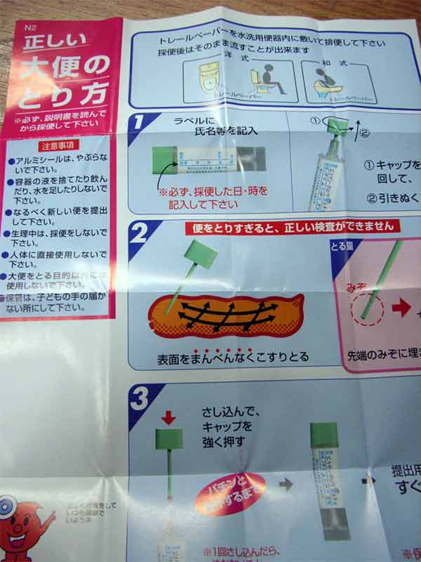 で、火曜日の晩あたりから、ほぼ正常になりかけていたので、水曜日に取ればいいやと思っていたら、なんと水曜日は全然便が出ないじゃないですか。ま、いいか、便がないならないで済まそうという覚悟で健康診断に向かいました。