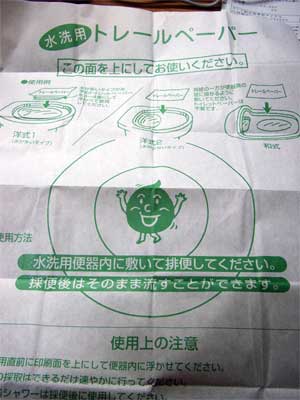 で、便座の中、水の上に浮かせて、その上に大便をするためのシートです。水溶性なのに、短時間なら水に浮かべておくことができるようです。
