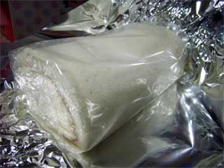 ホイルを開くとこんな感じ。真っ白なロールケーキの登場です。