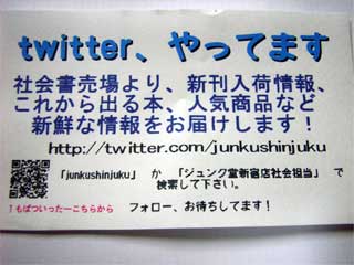 「フォロー、お待ちしてます!」と書いてありますが、あたしはつぶやかないので、フォローしようがありませんが、あたしの勤務先のつぶやき君たちはフォローしているのでしょうか? それとジュンク堂は各店がつぶやいているのでしょうか?