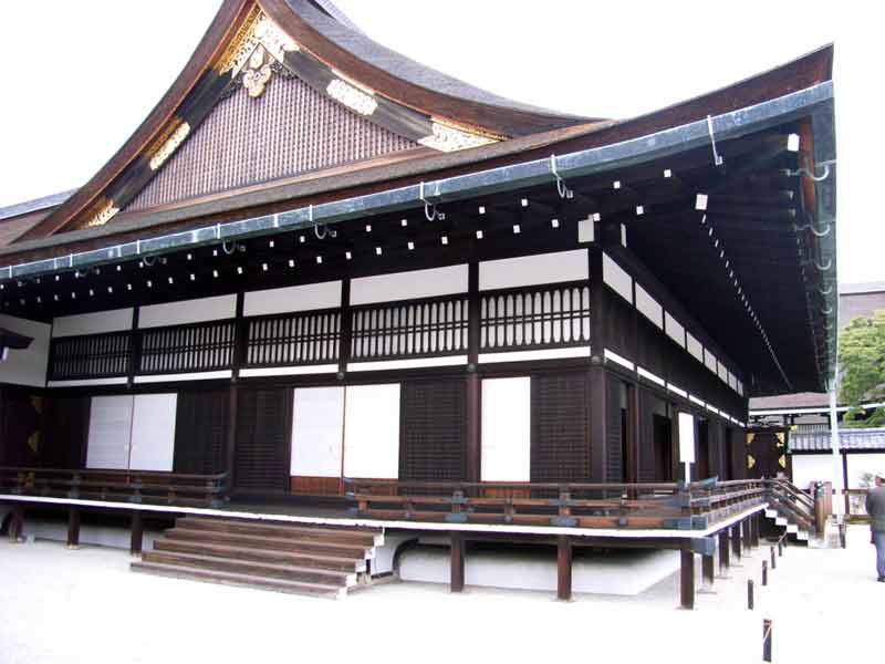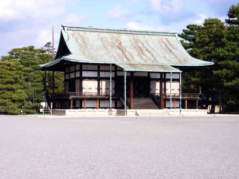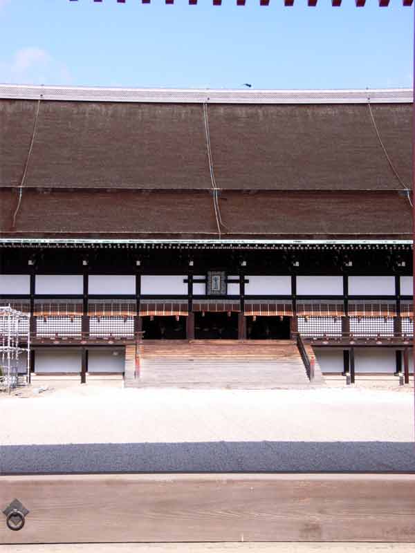 さてさて、いよいよ本殿である紫宸殿。南庭は入れませんでしたので、回廊の外からの見学ですが堂々としたものです。ガイドさんは「ししんでん」と言ってましたし、パンフレットにもそう書いてあるのですが、古典では「ししいでん」と仮名の振ってあるものもありますよね。どちらが正しいのでしょうか?