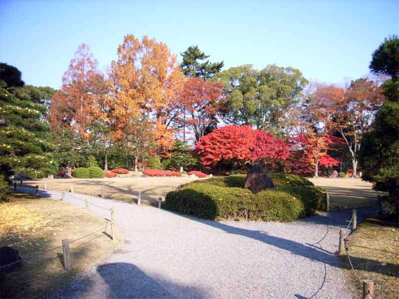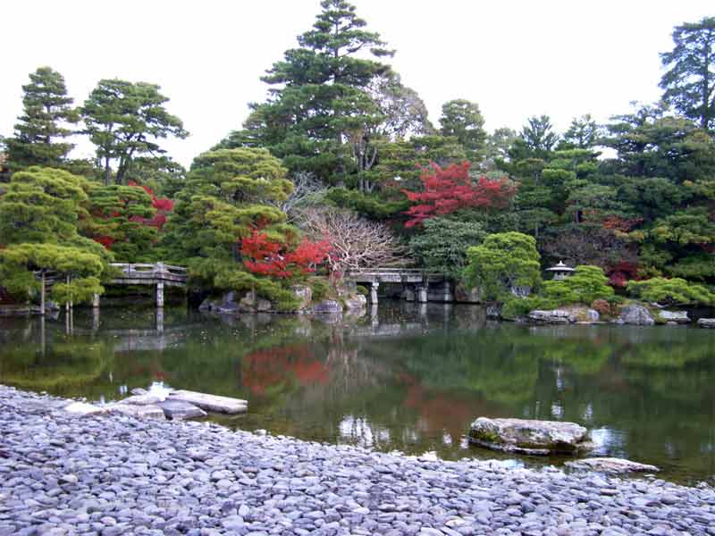 御学問所の東側は庭が広がっていまして、大きな池があります。紅葉はご覧のように、あまりパッとしませんが、庭はすてきでした。