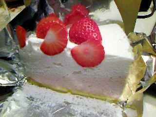 イチゴのショートケーキではなく、イチゴのチーズケーキです。下の方の、と言いますか、下層のピンク色の部分がレアチーズケーキになっています。白いところは生クリームで、これくらいふんだんにクリームだらけだと、もう食べるそばから幸せの骨頂です。
