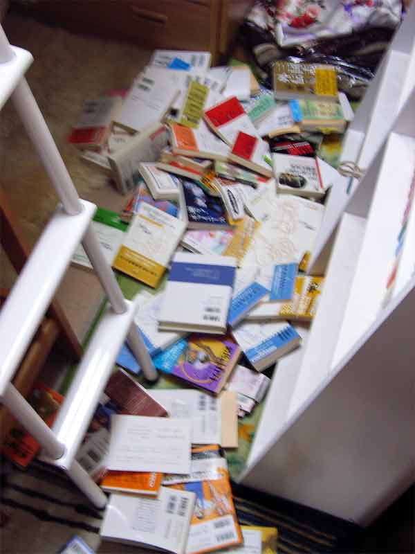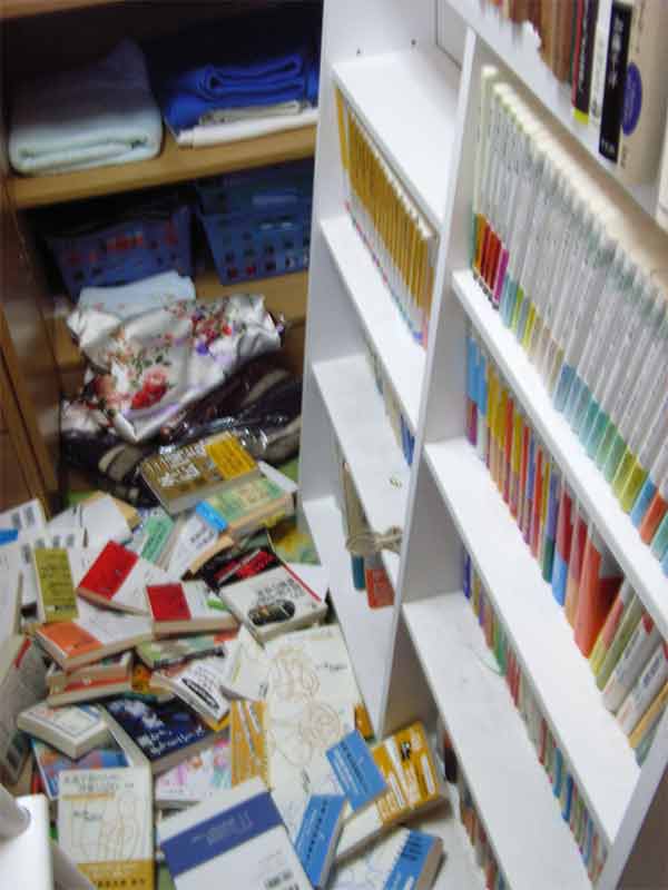 一部の本が書棚から落ちましたが、比較的無傷です。と言いますか、上の写真の本棚以外は本がギュウギュウ詰めに入っていたので、揺れても落ちなかったみたいです。