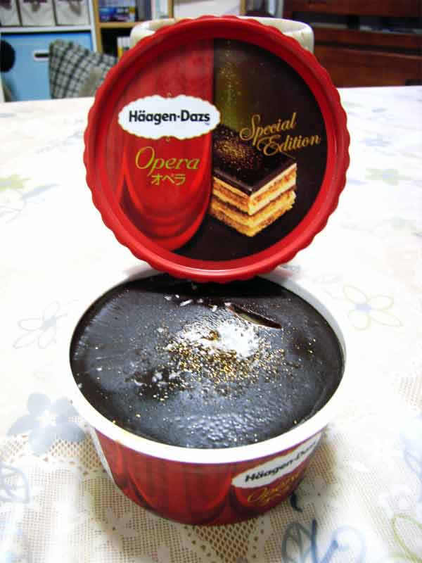 このところ、たまにテレビCMも流れていますが、ハーゲンダッツの新しい商品「オペラ」、わが家の近所のコンビニでは田舎すぎて売ってないだろうなあ、こういうのってやっぱり都心部のお店にしか出回らないんでしょ、と思っていましたら、あにはからんや、近所のコンビニでゲットできました。