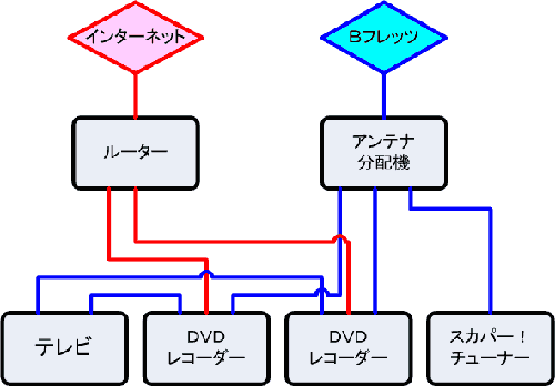 それに、スカパー!チューナーとビデオケーブルでつなぐのですが、既にDVDレコーダーとつながっているので、これも分配型ケーブルで繋がないとダメです(涙)。