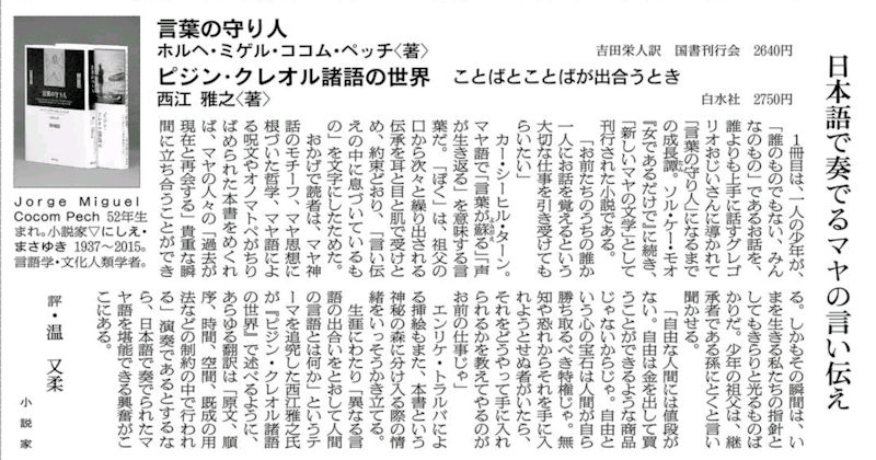 予告どおり、朝日新聞読書欄で『ピジン・クレオル諸語の世界』を紹介いただきました。評者は温又柔さん。『言葉の守り人』との合わせ技での紹介でした。