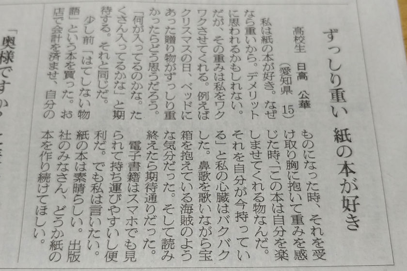 昨日は小学生の娘さんのことを書いたお母さんからの投書でしたが、今回は本人の言葉です。