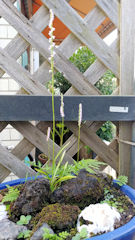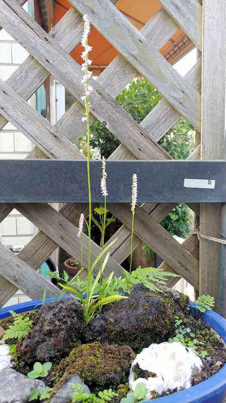 二枚目の写真は、溶岩石を置いた、ちょっとした盆栽みたいなことを試みた鉢で、ふだんは雑草だらけになっているのですが、現在はご覧のように、ネジリバナがすっくと立っています。この凛々しい姿がなんとも言えずよい感じです。