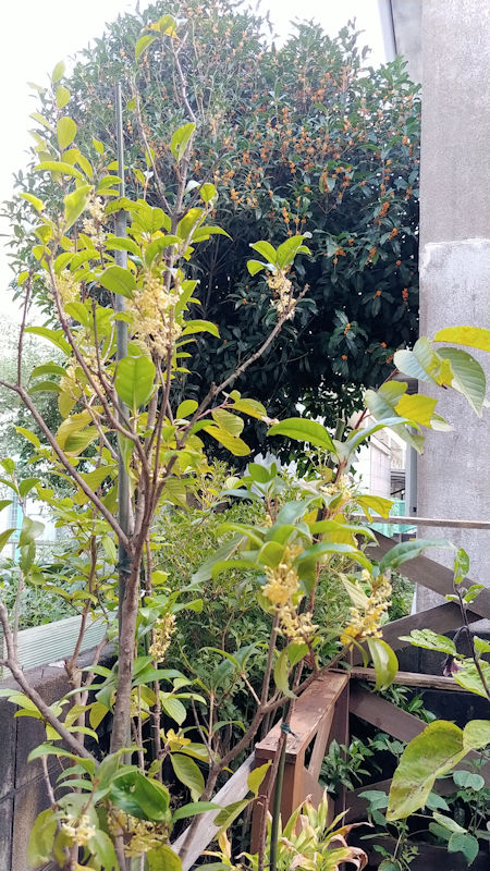手前のギンモクセイは、わが家の庭に鉢植えで咲いているものですが、キンモクセイは隣の家の庭に植わっているものです。この時期に、どちらも揃って咲き始めました。