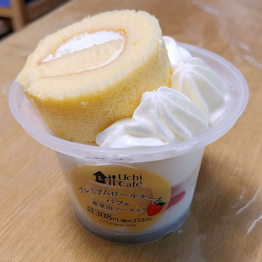 で、先日、駅前のローソンへ寄ってスイーツを買ってきました。それが写真です。「プレミアムロールケーキパフェ 苺果肉ソース入り」と言います。名前のとおりロールケーキの入ったもので、クリームたっぷりで美味しいのですが、惜しむらくは下までロールケーキばかりなのはちょっと飽きます。プリンでも入っていたらよかったのにと思いました。と言うよりも、そういうものだと思って買って食べてみたら、そうでなかったのでちょっとがっかりしたというのが本音です。