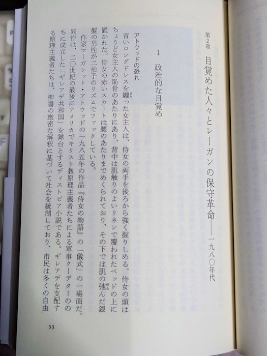 『福音派』が取り上げているのは、もちろん彼女の代表作と言ってよい『侍女の物語』です。そこに描かれている世界が福音派や原理主義的な立場が強くなった世界を暗示していると解釈できるからなのでしょう。そして数十ページ読み進めていくと