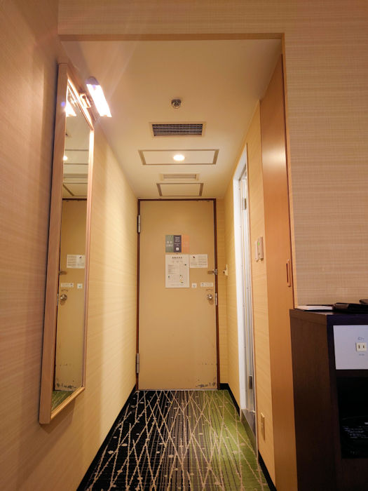 今回泊まったホテルの部屋です。ベッドやデスクのある方から入り口を見たところです。右下の方に見えているのがベッドで、入り口に向かって右側にトイレ・シャワー室がある、という間取りです。