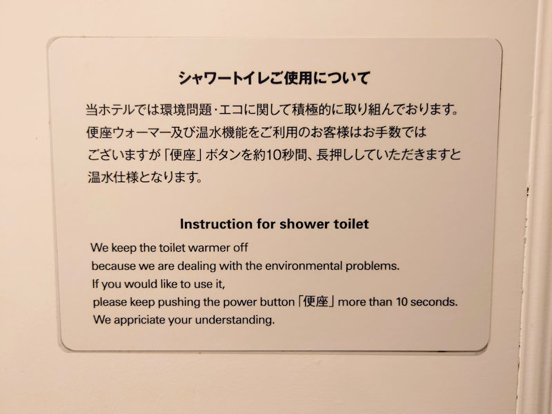 そんなホテルのシャワー室に貼ってあった掲示が二枚目の画像です。エコな取り組みについて書かれています。この日本語に対する英語は直訳ではないですよね。Google翻訳などでこの日本語を英訳したら、下の英語にはならないはずです。