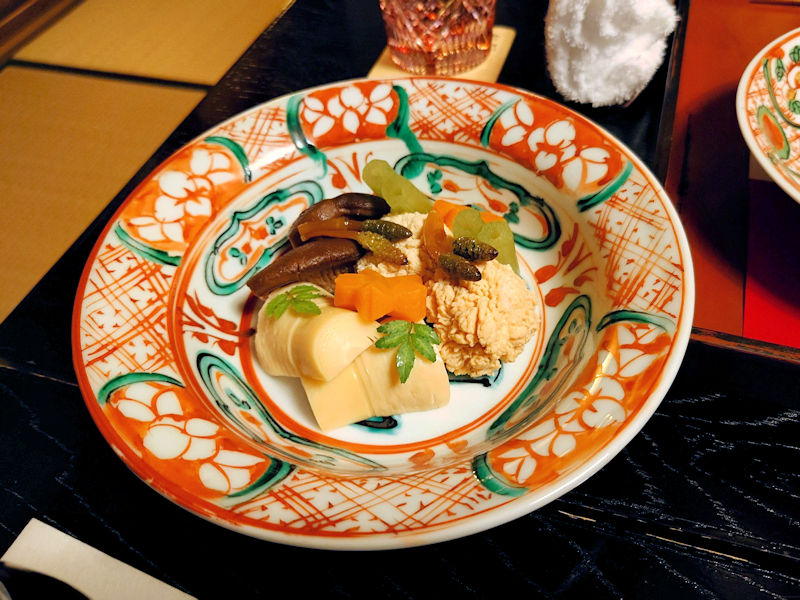 まずは座付です。一つの更に二つずつ盛り付けてあり、取り分けていただきました。旬の筍が嬉しかったのと、鯛の子がとても美味しかったです。