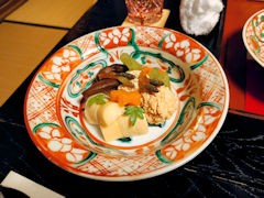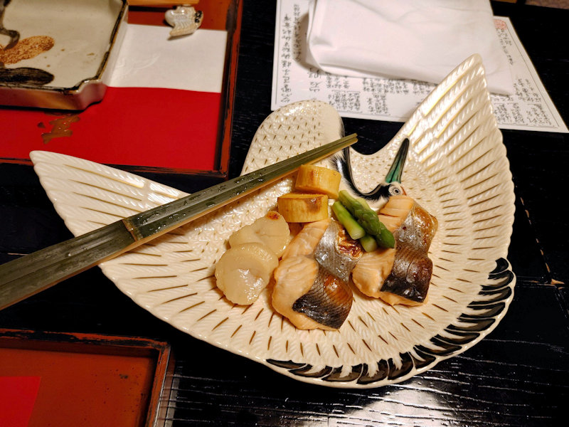 その次の焼物は、これも一皿に二つずつ盛り付けられていて、そこから取り分けていただきました。お皿も縁起物の鶴の意匠でした。こういう細かなところにも、母の誕生日という心づかいが見て取れます。