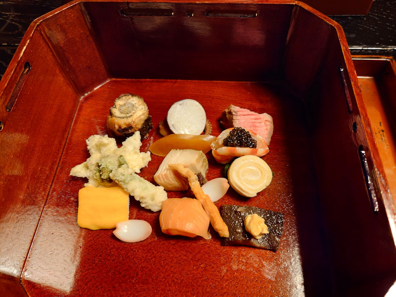 続いては前菜です。鰻の八幡巻きをはじめ、十品以上はありました。これで前菜なのですから、この後の料理が楽しみになります。蕗、楤の芽それぞれの天麩羅がサクサクしてとても美味しかったです。