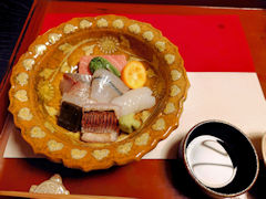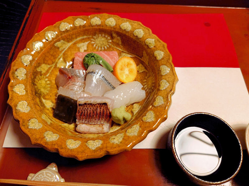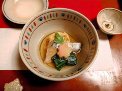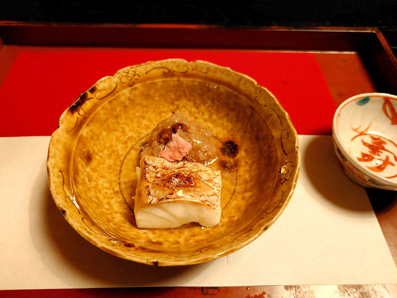 そして次は炊合。ここに入っていた焼豆腐が非常に面白い食感、初めていただきました。今シーズンの初鰹も美味しかったです。