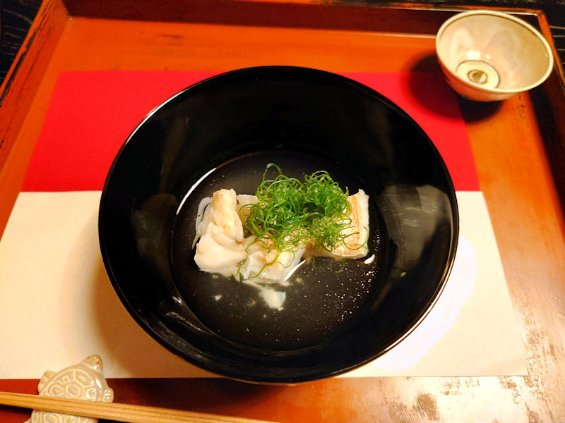 蒸物は、丹波ぐぢの酒蒸し、つまり鯛ですね。先程の茗荷と同じように非常に細かく切られた葱が美しかったです。