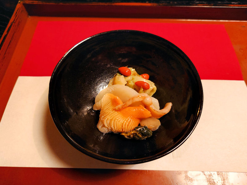 酢肴は赤貝などに枸杞の実を散らしてありました。鉄砲和の鉄砲は「てっぽう」ではなく「てっぱい」と読むそうです。いろいろ勉強になります。