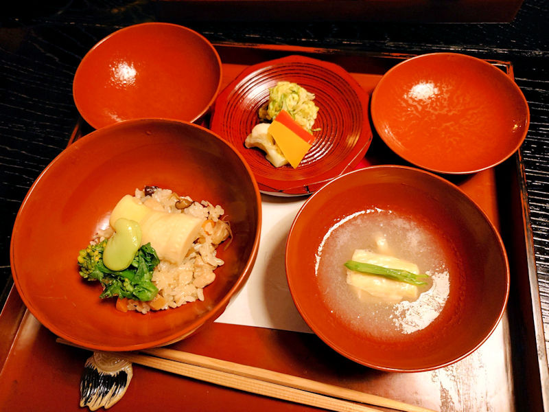 御飯と出てくるのは味噌汁かと思いましたが、見事に裏切られました。湯葉をいただいて、京都へ来たなあと感じました。御飯は五目おこわでした。