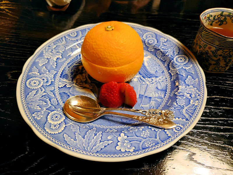 御飯も済んでデザートは八朔ゼリーです。蓋の部分には八朔の実が残っていて、それを搾ってゼリーにかけると、ゼリーの味変ができ、とても美味しかったです。