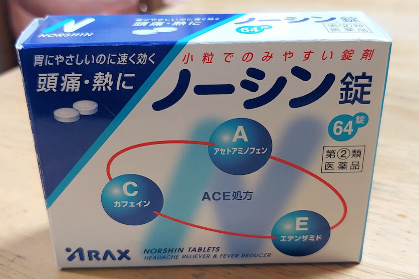 とはいえ、体調が悪くなると、あたしの場合、まず頭痛として症状に現われるので頭痛薬は必需品で、わが家にはご覧のように「ノーシン」が置いてあります。ノーシンにもいくつか種類があると思いますが、たぶんこれはごくごく一般的なタイプだと思います。ごくごく軽めの症状の時は、これを服用しています。