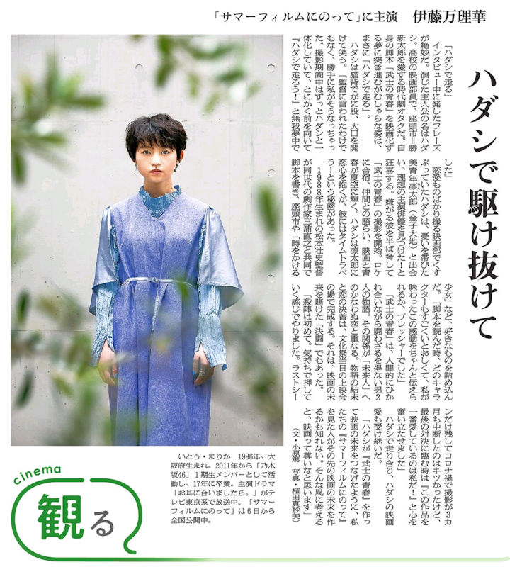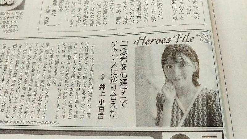 そして、同じく朝日新聞の夕刊に、元乃木坂64のメンバー、伊藤万理華(まりっか)のインタビュー記事が載っていました。こちらはななんとカラー写真も載っています。