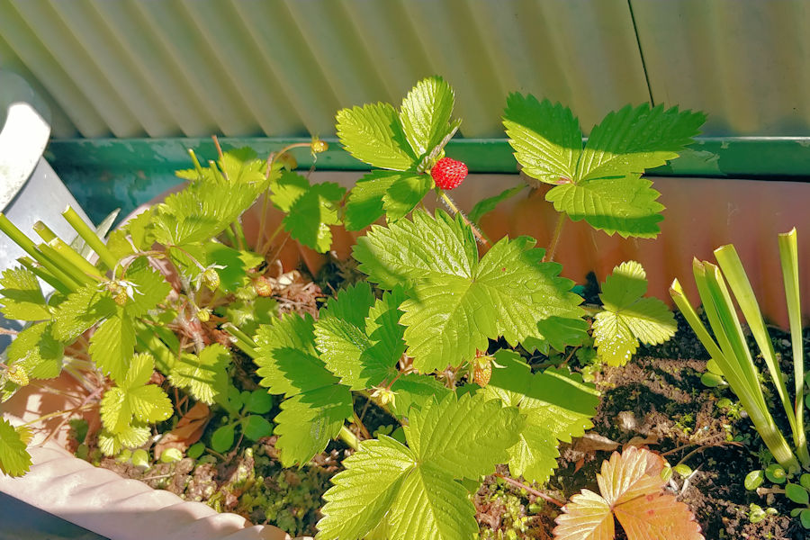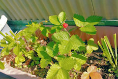 そして、写真をよーく見ていただければおわかりのように、赤いのは一つだけですが、まだ色づいていない苺がいくつもなっているのがわかると思います。順次色づいていくのでしょう。食べられるのか否かはわかりませんが、なんとなく嬉しくなってしまいます。
