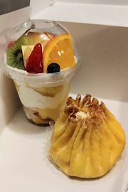 そしてデザートはモンシェールのスイーツです。奥のパフェは過去にもいただいたことがある定番商品です。そして手前は今回初めていただいた「幸せ包み」です。いままでも売られていたようですが、これまではロールケーキばかりに目が行っていて見落としていたようです。