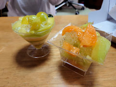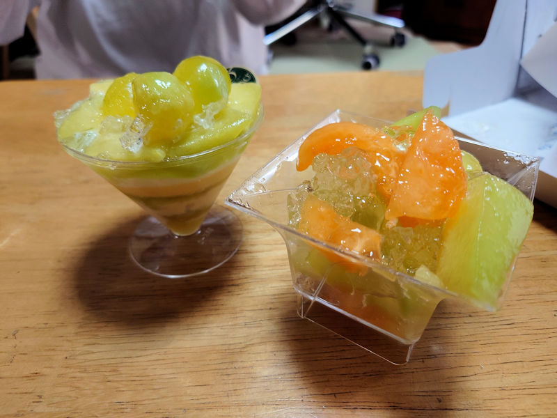 写真の左が「夏メロンの幸パフェ」、右が「美果樹~2色メロン~」です。