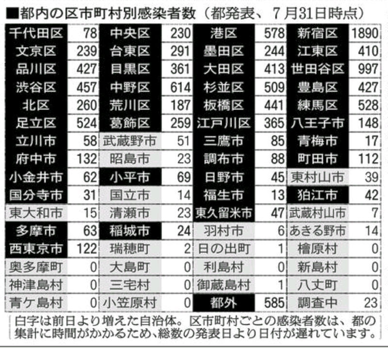 さて、あたしの住む小平市が白抜きの文字になっていまして、小平市以外にも白抜きの区市名が散見されます。これは前日よりも増加している区市を示していまして、つまり小平市は昨日も新規感染者がいたということです。