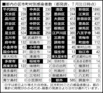 どの新聞も似たり寄ったりだと思いますが、わが家で取っている朝日新聞はご覧のような表を朝刊紙面に掲載し、前日のコロナ新規感染者の数を発表しています。東京版(多摩版)なので東京都のみですが、たぶん地域によって異なるのでしょう。