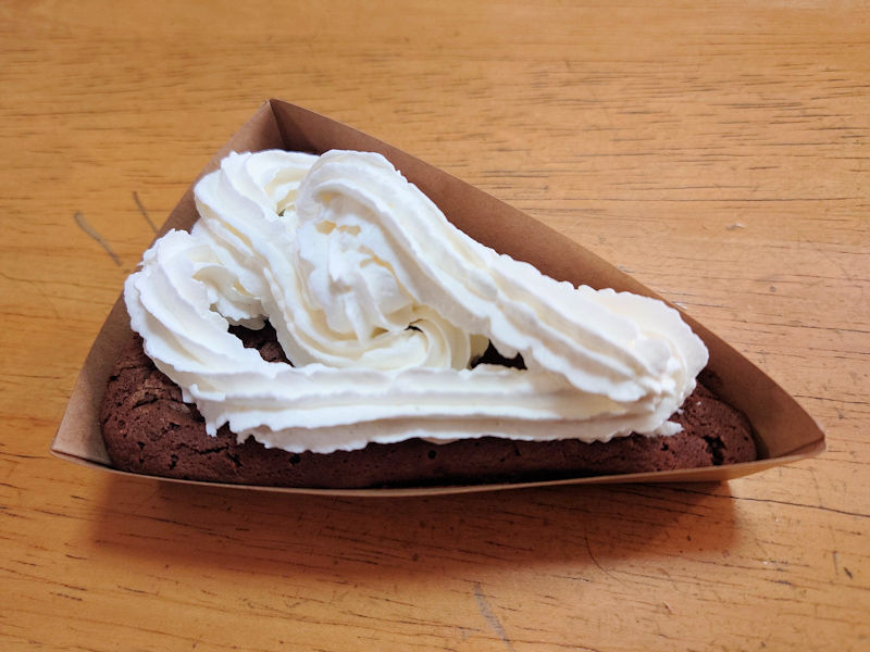 プレーンの、という言い方がガトーショコラに相応しいのかどうかわかりませんが、その姪っ子からは、ホイップクリームを付ける、バニラアイスを乗せたりして食べるとより美味しくなると言われたので、近所のスーパーでホイップクリームを買ってきました。