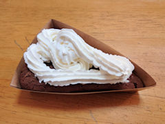 言われたとおり、デコレーションしたのが二枚目の写真です。ホイップクレイームを付けすぎでしょうか? でもあたし、こういうケーキのクリームって大好きなので、これくらいは付けないと気が済みません(笑)。ガトーショコラがちょっと堅めなので、柔らかいホイップクリームがちょうどよい感じです。