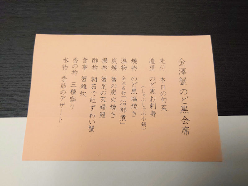 というわけで夕食はどこか食べるところを探さないとなりません。母の足を考えると駅の近くがいいなと考え、選んだのが大名茶家というお店です。あらかじめコースを頼んでおいたのですが、そのメニューが一枚目の画像です。のどぐろに蟹と北陸の味覚を堪能できそうなコースです。