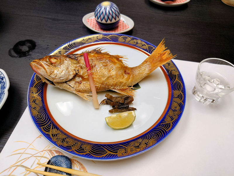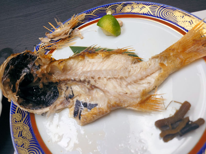 続いては、のど黒塩焼き。のどぐろってこんな形状の魚だったのですね。そしてこののどぐろ、脂が乗っていて絶品でした。もうこの塩焼きとご飯に味噌汁さえあれば大満足という逸品でした。