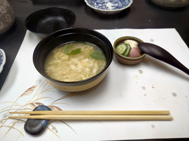 美味しくいただいてきた食事もいよいよ佳境です。ふつうなら白いご飯と味噌汁が出そうなところですが、ここでは蟹雑炊と香の物です。温かい雑炊が五臓六腑にしみわたり、〆に相応しいものでした。もちろん蟹の風合いも存分に感じられる味でした。
