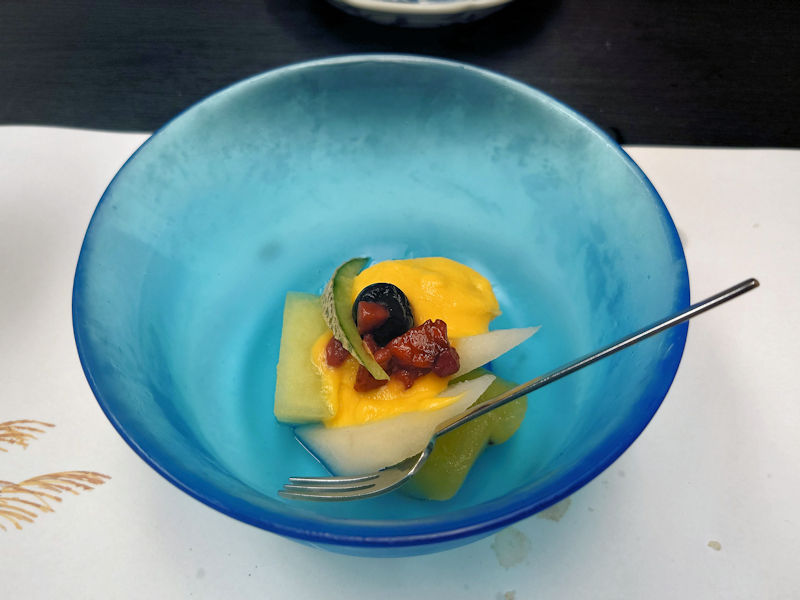 最後にデザートです。季節柄、柿と梨が数切れずつさらに乗って出されるのかと思っていたのですが、予想を裏切られました。メロンと梨とキウイが入っていましたが、上のソースがなんだったのか、よくわかりませんでした。