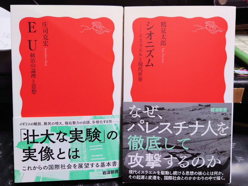 話は変わって、久しぶりのコンビニスイーツならぬ、久しぶりの岩波新書です。今月の新刊『EU』と『シオニズム』の2点を買いました。