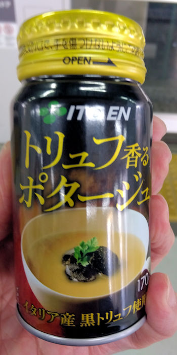 「トリュフ香るポタージュ」です。JRの駅のホームにある自販機で売られていました。他でも売っているのか、コンビニやスーパーでも売られているのか、全くわかりません。
