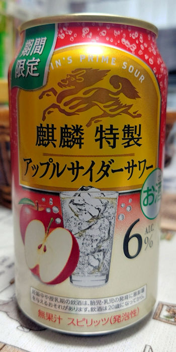 飲み物ついでに、この週末に近所のスーパーで見つけたアルコール飲料がこちらです。「麒麟特製アップルサイダーサワー」と書いてあります。アップルですから、シードルみたいなものではないかと予想しています。アルコール度数が6%とあるので、ほろよいなどと比べるとちょっと高いですね。