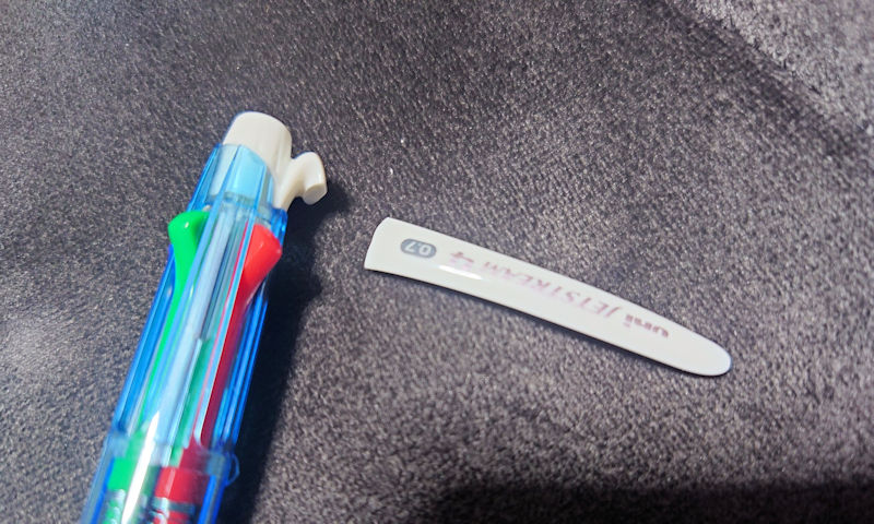 それは何かと言いますと、仕事で使っている四色ボールペンのフックと言うのでしょうか、ポケットなどに引っかける部分がまたしても折れてしまいました。このように折れてしまうと、ポケットなどに引っかけられないだけでなく、本体の方も折れた部分が尖っていて触ると痛いのです。これではもう使えません。